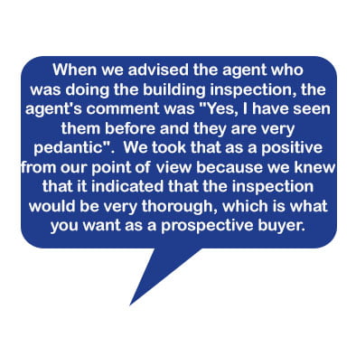 “Thank you so much for your inspection of the property we are purchasing. We were more than impressed with the comprehensive and personally detailed report you provided us. Further to this we appreciated your advice, professionalism and experience. We look forward to employing your services again for our next purchase and will confidently recommend your business to everyone”.