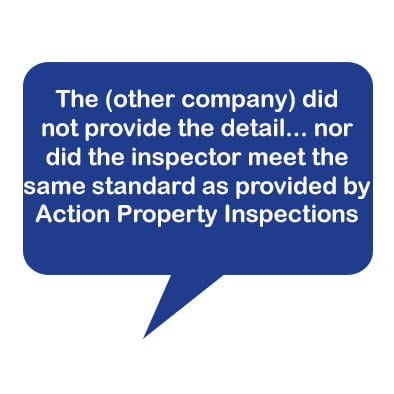 “My experience with Action is the same as it has been for the last two times I’ve used your service. I find you very professional, thorough, straight-forward and prompt. I am really impressed with the report that you prepare – the photos are a great inclusion, and the report as a whole is far more detailed than any other report I have seen from other companies”.