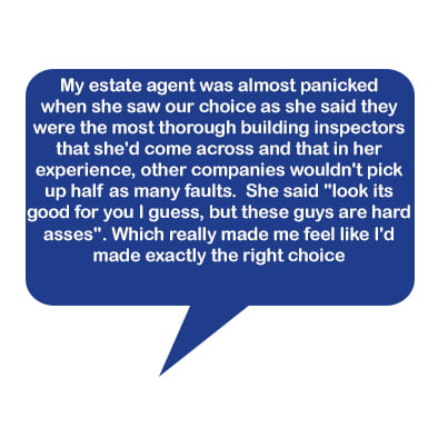 “Thank you so much for the timeliness, thoroughness and conciseness of your building report. We have decided not to proceed with the purchase of the property that this report relates to. The professionalism, and format of your building report made our decision a very easy and confident one to make. I will certainly be using your service in the future and would strongly recommend the same for friends and family.